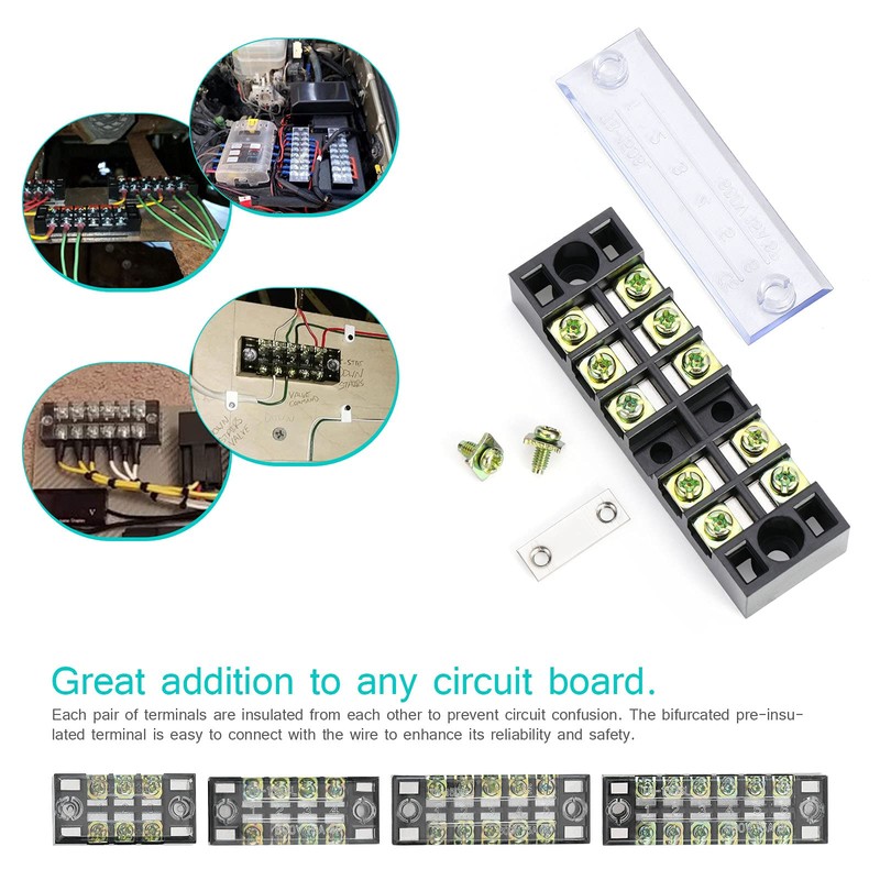 • 【Easy Installation】There are two screw holes at each side. Just fix them with screws and connect cables. 3/4/5/6 positions terminal blocks to meet your different needs of wiring on electric power, home appliance, and more automatic equipment.