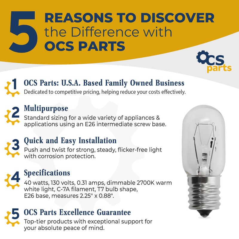 OCS Parts 40T7N Light Bulbs | E17 Intermediate Screw Base | T7 Bulb Shape | 40 Watt 130 Volt Replacement Appliance Lamps | 2-Pack