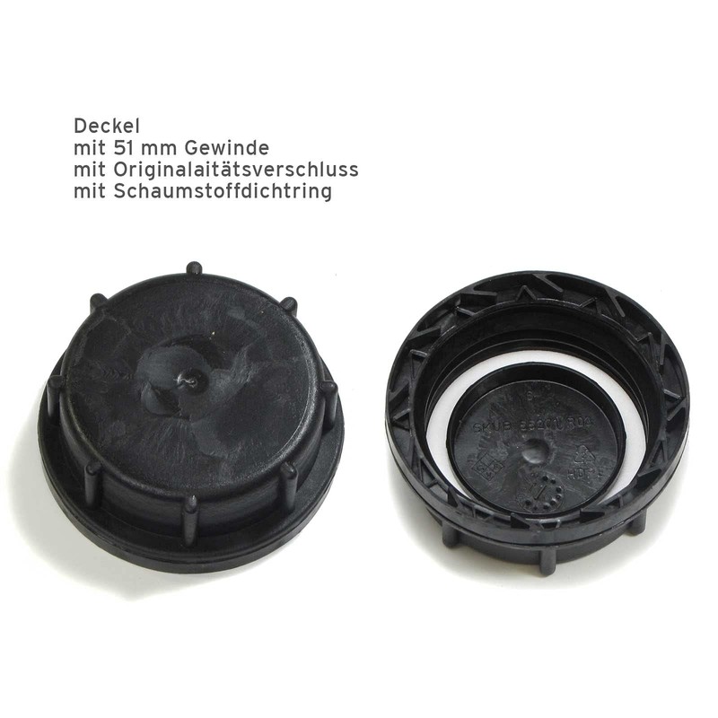 The canister comes with a very tightly closing screw cap DIN 51 mm, black with PE foam ring seal and an inherent ring underneath.