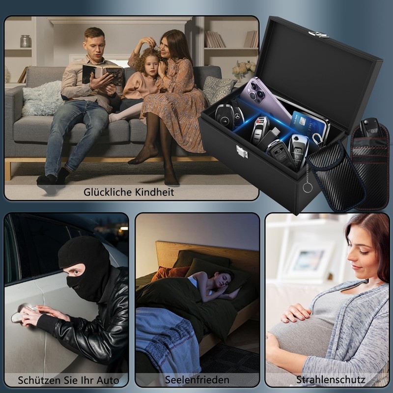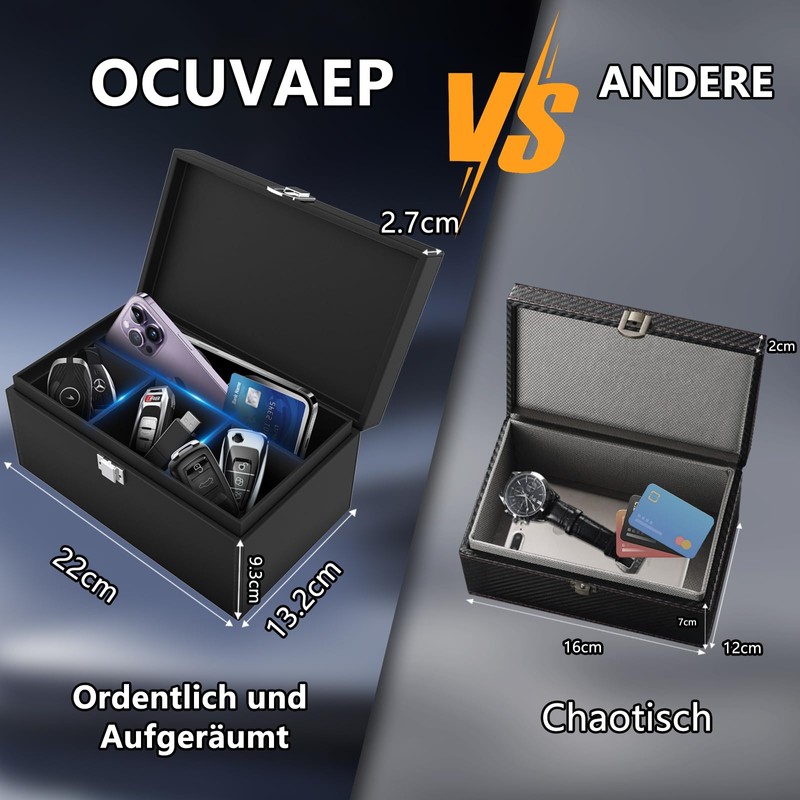 - Upgraded Separate Space: This car key box (size L: 22 x W: 13.2 x H: 10.5 cm) has been equipped with an amazingly large inner capacity. Key box Keyless Go protection has well thought-out compartments with separate compartments for car keys, mobile phones and bank cards. This design ensures that your items are neatly stored and protected from scratches or damage.