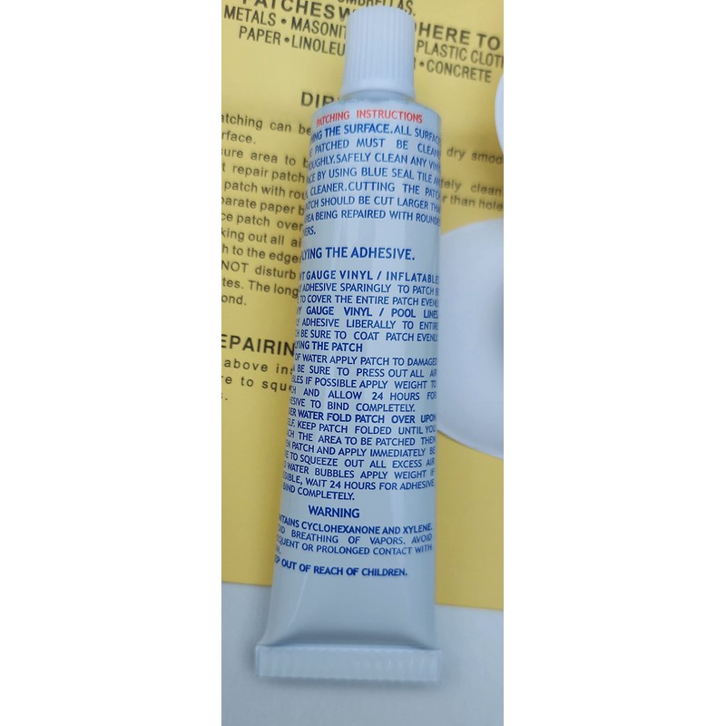 - MULTI PIECE PUNCTURE REPAIR KIT: Each kit contains 1 x very large 58cm x 14cm vinyl repair patch, 4 oval patches 7cm diameter, 1 patch 7.5x18cm 1 x 30ml tube of adhesive and an application tool. Patches can be cut to size to meet your specific needs.