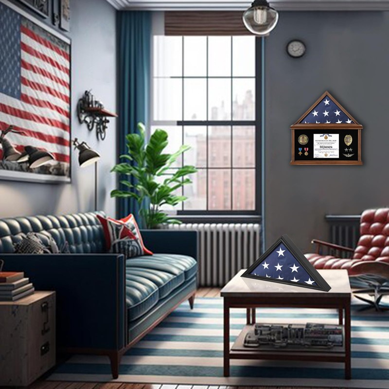 - 5'x9.5'Flag Display Case with Folded Flag Instruction - Display your folded 5'X 9.5' flag in style with our top triangle storage area (21.77"W X 15.47"H X 2.6"D) designed for Army, Navy, Air Force Veteran Burial Funeral Flag. A detailed folded flag instruction is included for your convenience.