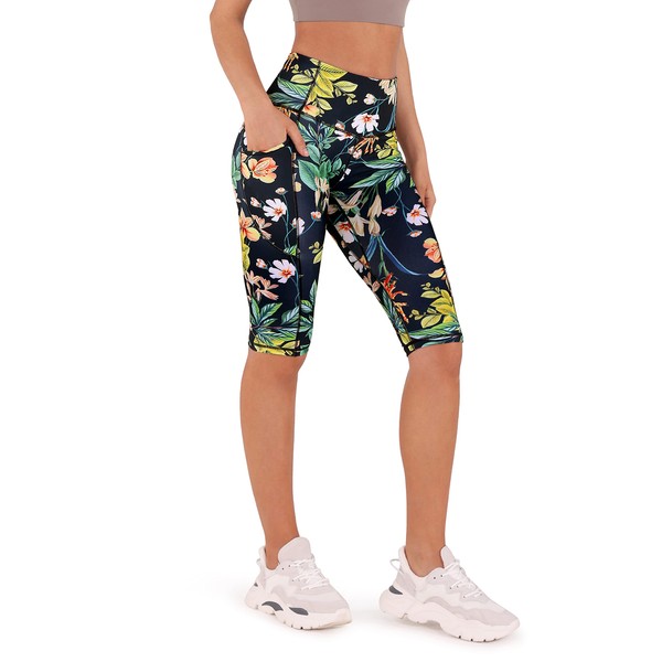 ODODOS Women's Knee Length High Waisted Yoga Capris with Pockets, Pattern Workout Athletic Running Capri Leggings, Tropical Flower, X-Large
