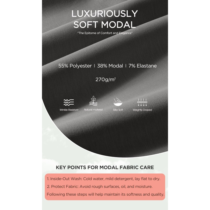 - Modal Soft: Made of ultra soft modal fabric blend with polyester and spandex, 270g/m² medium weight fabric, weightly draped, moisture absorption and wrinkle-resistant, keep the shape of the pants well.