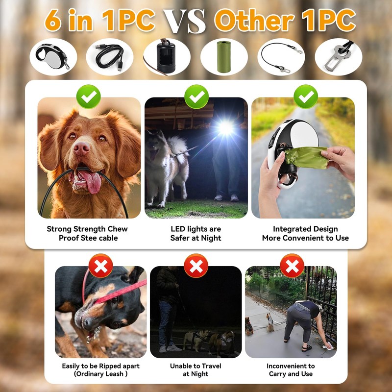- 【6-in-1 Perfect Match】: This retractable dog leash has been upgraded to a 6-in-1 configuration, equipped with a built-in LED light, USB Type-C charging cable, built-in 600 mAh lithium battery, 2 poop bags and dispensers, 20*2 inch anti-chew steel cable, integrated design makes it easy to carry. If you have a dog who likes to chew, please put the anti-chew steel cable at the end of the leash, which can perfectly solve the risk of being bitten off.