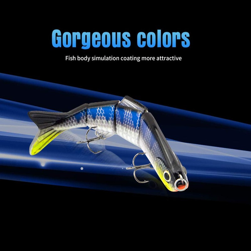 • The fishing lure is made of ABS material and is equipped with a 4-segment body connected by metal hinge.