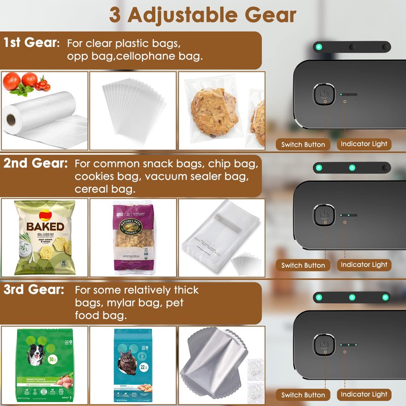 - 3 gears adjustable: the bag sealer has 3 adjustable gears that allow bags of different thicknesses to be sealed. The 1st Clear plastic bag aisle, opp bag, cellophane bag. The 2nd Gear for standard snack bags, chip bags, biscuit bags, vacuum bags, cereal bags. The 3rd Gear works for some relatively thick bags, mylar bags, pet food bags.