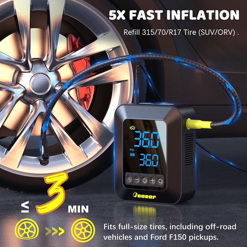 - Efficient Performance and Heat Dissipation: Features a 12000mAh battery for long-lasting power, capable of inflating up to 5 car tires on a single charge. The back air vent design promotes heat dissipation.