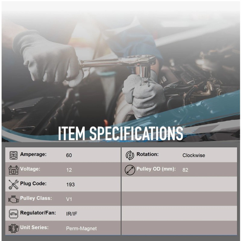 Product Type: Alternator; Condition: New; Unit Series: PMA; Voltage: 12V; Amperage: 60A; Rotation: CW; Regulator/Fan: IR/IF; Plug Code: 193; Pulley Class: V1; Pulley OD: 82mm; Mounting Hardware Included: No; Country of Origin: CN; Notes: PERMANENT MAGNET