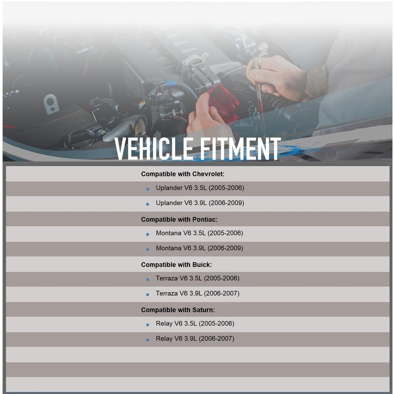 - Compatible With Chevrolet Uplander LT 3.5L 2005-06; Uplander LS 3.5L 2005-06; Uplander LT 3.9L 2006-08; Uplander LS 3.9L 2007-08; Compatible With Pontiac Montana SV6 3.5L 2005-06 - See the Description for more Applications