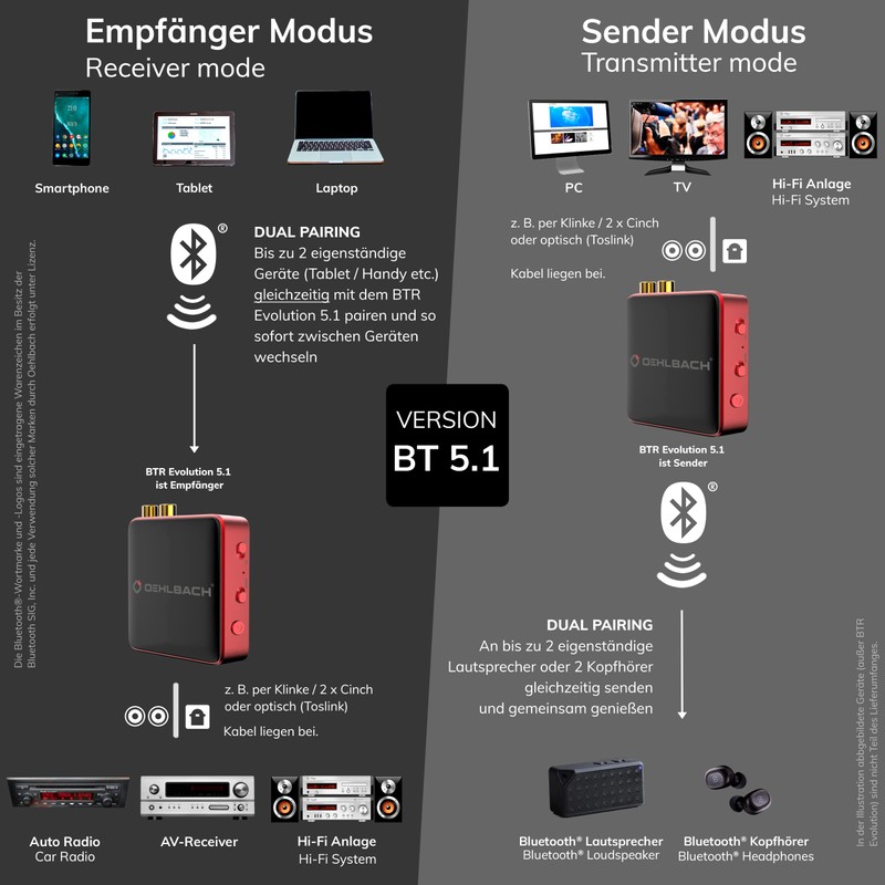 - Function: The BTR Evolution 5.1 is a Bluetooth transmitter/receiver for high-quality HiFi use and gives the Bluetooth standard 5.1 completely new possibilities