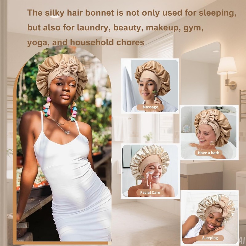- 【ELEVATE YOUR ROUTINE】 Silk bonnet not only a bonnet for sleeping, but also wearing when washing, beauty, makeup, and housework. It keeps your hair away from your face, offering added convenience and making it a must-have for your daily routine.