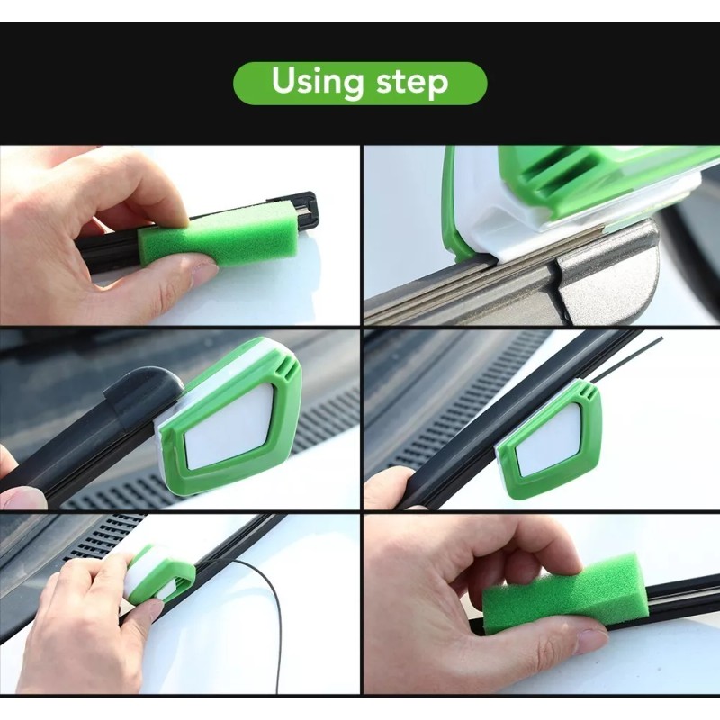 - 1. Quitar el limpiaparabrisas, 2. limpiar perfectamente las gomas, 3. con la abertura mas pequeña pasar el producto en direccion como lo indica la flecha (del producto) haciendo una ligera presion (no demasiada) y corte la goma de manera uniforme hasta el final. 4 Volver a limpiar (esta ocacion con trapo y su esponja) y colocar