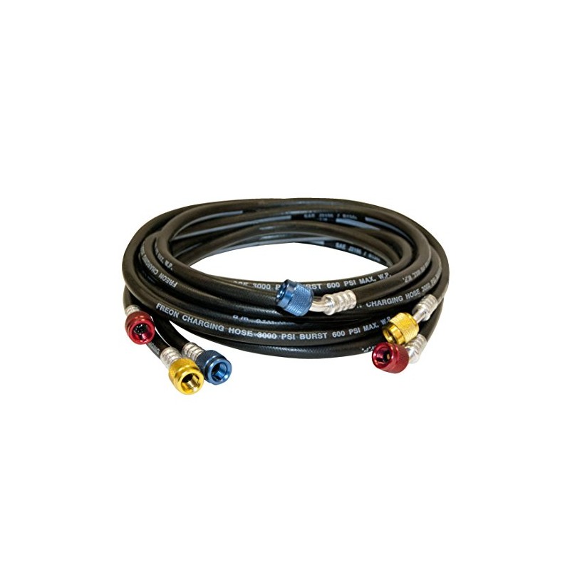 - EASY IDENTIFICATION: Not only do the couplers at the end of each refrigerant hose set have a deep knurled position, they are also color coded to allow for easy identification; These HVAC hoses and fittings are a necessary tool kit addition