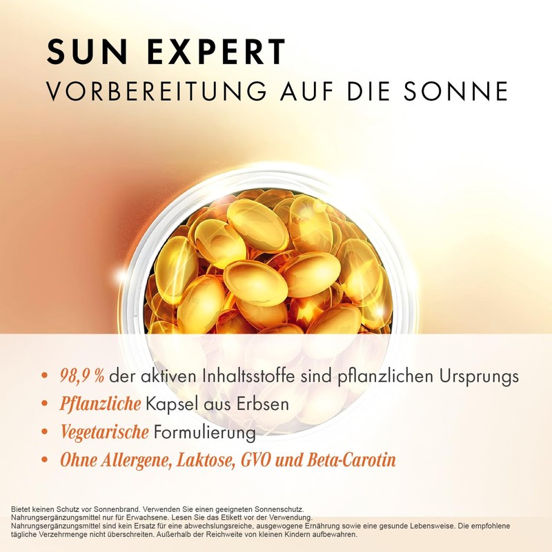 • Recommended use: take 1 capsule per day during a meal, one month before, during and after sun exposure. Does not protect from the sun and does not provide protection against sunburn. Be sure to use a suitable sun protection. Suitable for adults only.