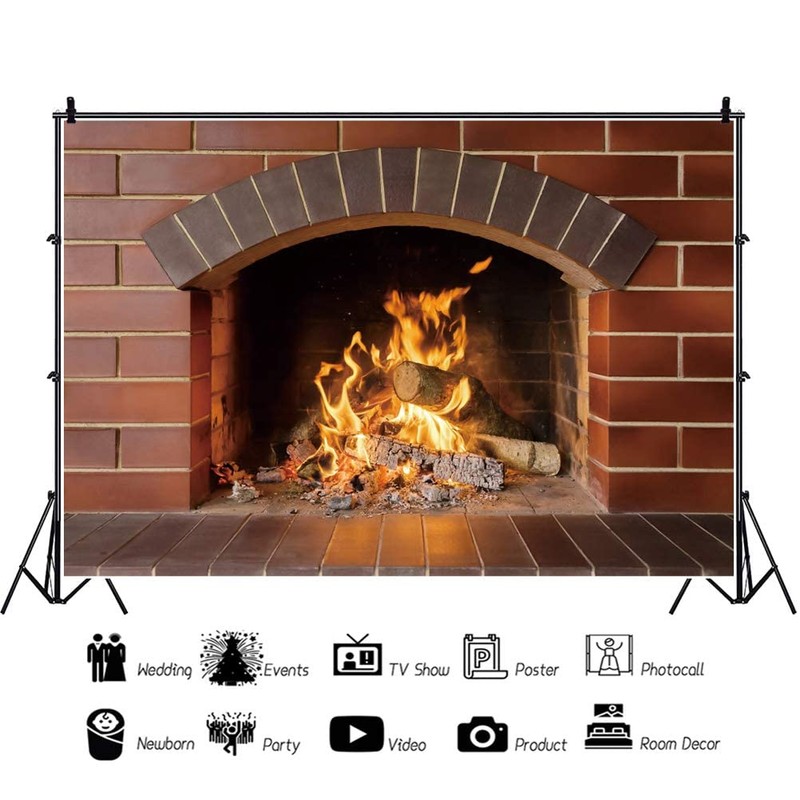 OERJU 7x5ft Red Brick Wall Fireplace Backdrop Burning Firewood Blazing Fire Winter Christmas Party Decoration Photography Background Kids Baby Adult Portrait Photo Booth Shoot Vinyl Studio Props