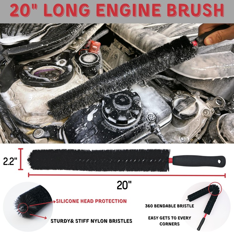 • Efficient & Time-Saving: 3 kinds of brushes easy scrub stubborn road grime, dust, or oil residue from your engine, Easily bend and shape the flexible brush rod to fit around engine bay, into tight spaces, and behind, Dry off the excess water and apply sealant to the bay with edgeless microfiber towel