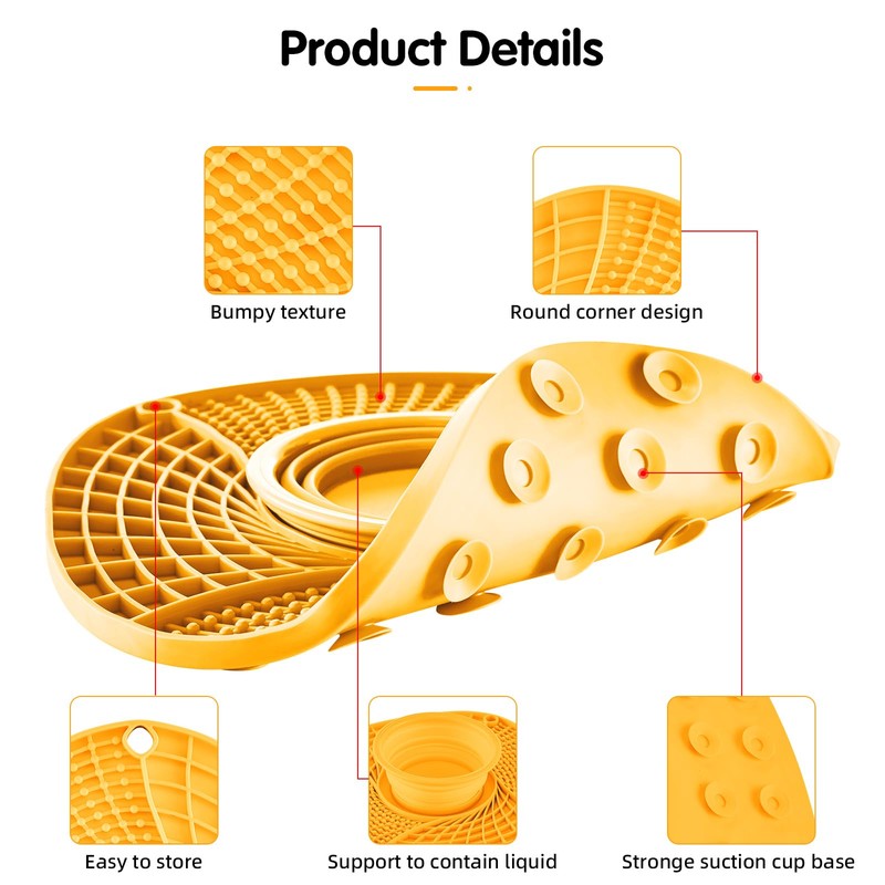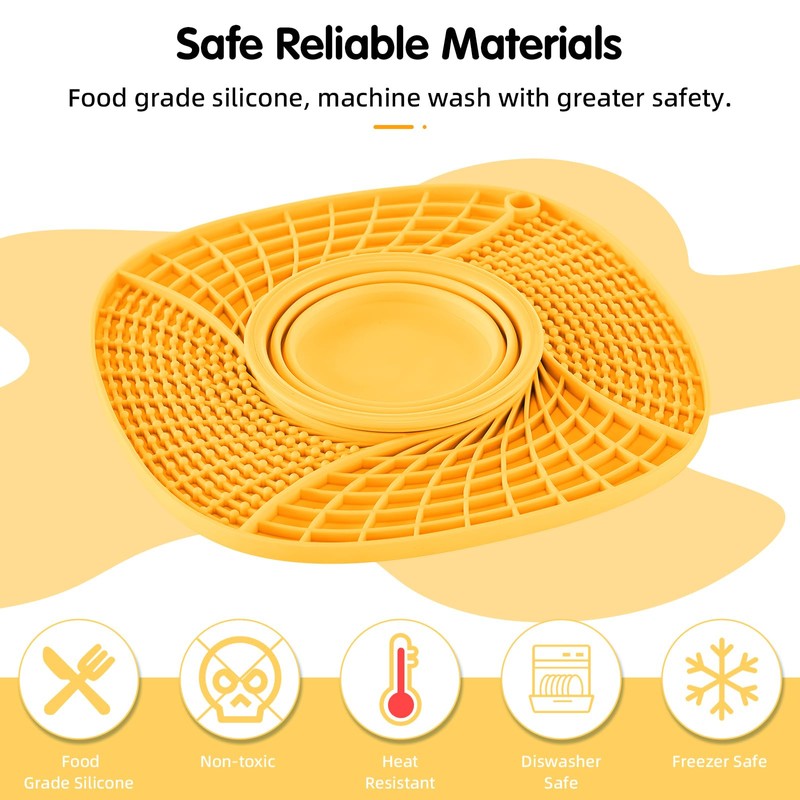 - Food Graded Silicone Lick Mat: This slow feeding mat for dogs and cats is made from high quality food grade silicone material, which is safe, non-toxic, heat resistant, durable and elastic. It will not break and the slightly raised edges effectively prevent food from spilling out, making it very convenient for pets to enjoy their meals.