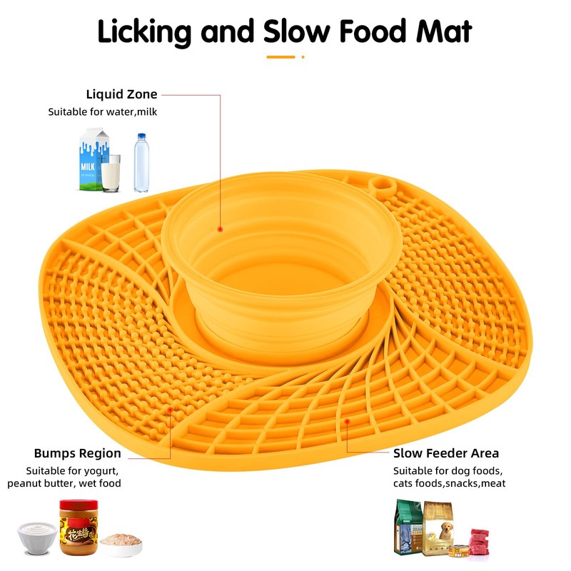- Upgraded 3-in-1 Slow Feeder: This pet licking mat for small dogs and cats is designed with 5 feeding areas suitable for different types of pet food. The food tray has four quadrants, two slow feeding areas can hold solid food such as snacks, beef jerky, etc; two licking areas with circular textures can hold yogurt, peanut butter, etc. The foldable bowl in the middle can be used to hold liquid drinks such as water, milk, etc.