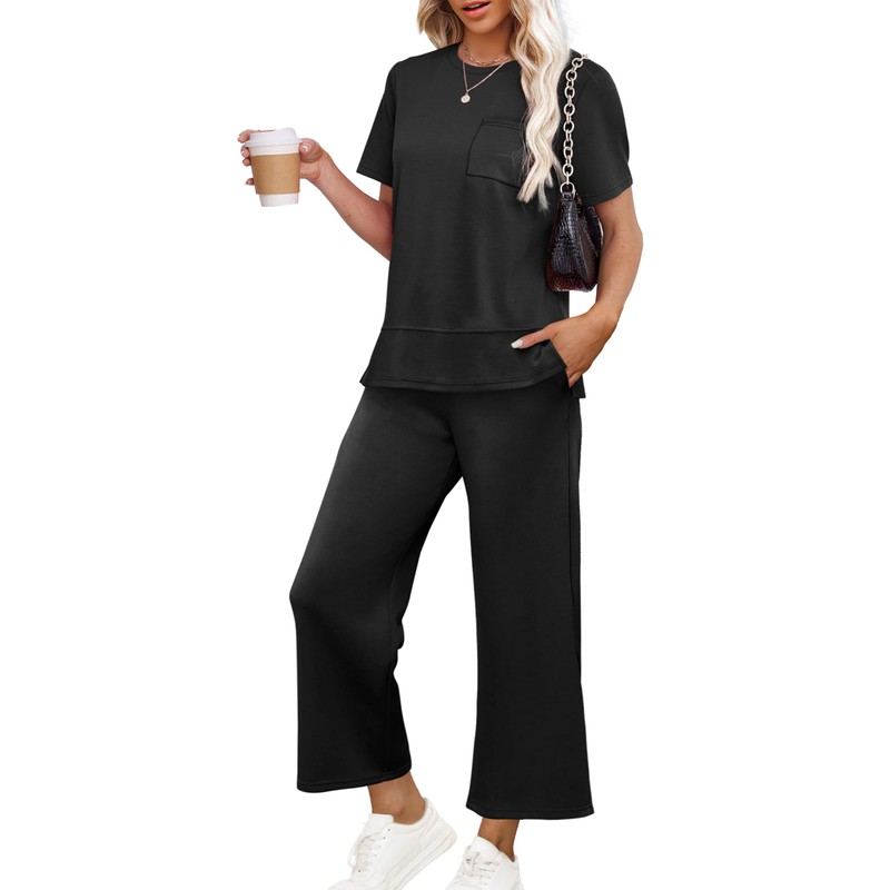 OFEEFAN Lounge Sets for Women 2 Piece Summer Outfits Fashion Travel Short Sleeve Tracksuit Wide Leg Loungewear Cropped Pants Matching Clothing Set Resort Wear Women's Beach Vacation Clothes Black L
