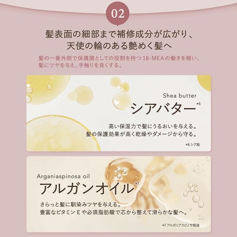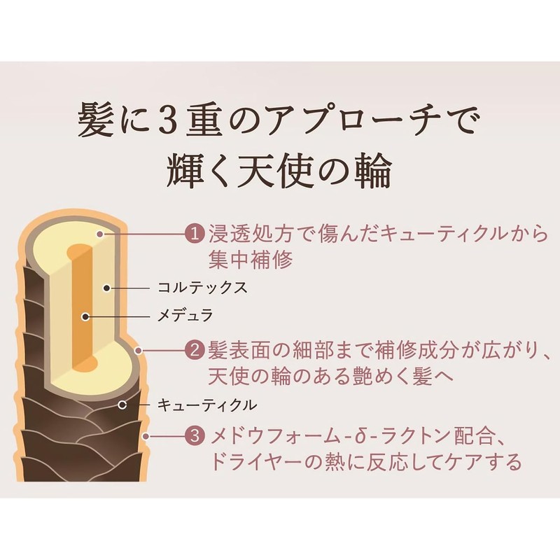 - 2. Repair components spread to the details of the hair surface, for glossy hair with angel loops: Complementing the function of 18-MEA which acts as a protective film on the outside of the hair, giving the hair a glossy shine and a good texture