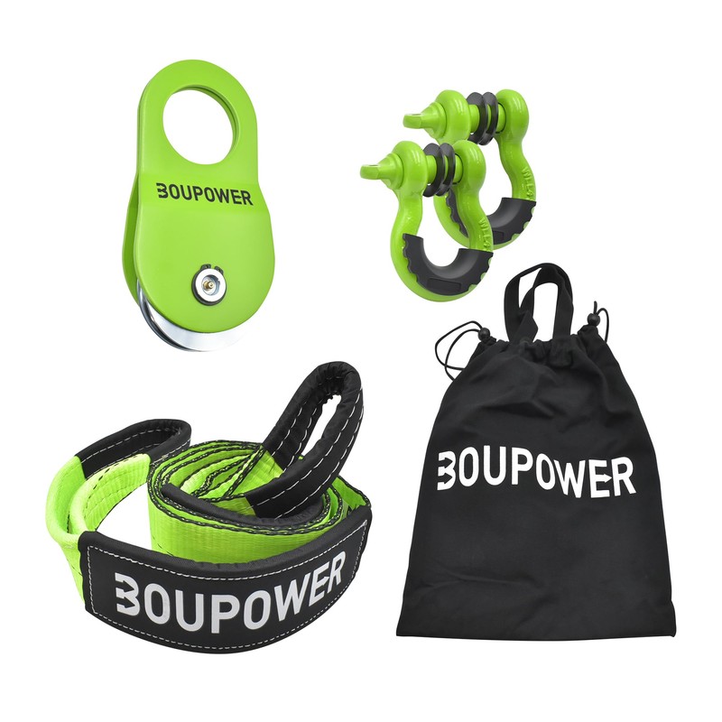 - OFF-ROAD RECOVERY KIT: Tow recovery kit includes 1pcs 3'' x 8' tree saver strap (breaking strength 35000lbs), 2pcs 3/4" D-ring shackles, 1pcs 10T snatch block and a portable storage bag.
