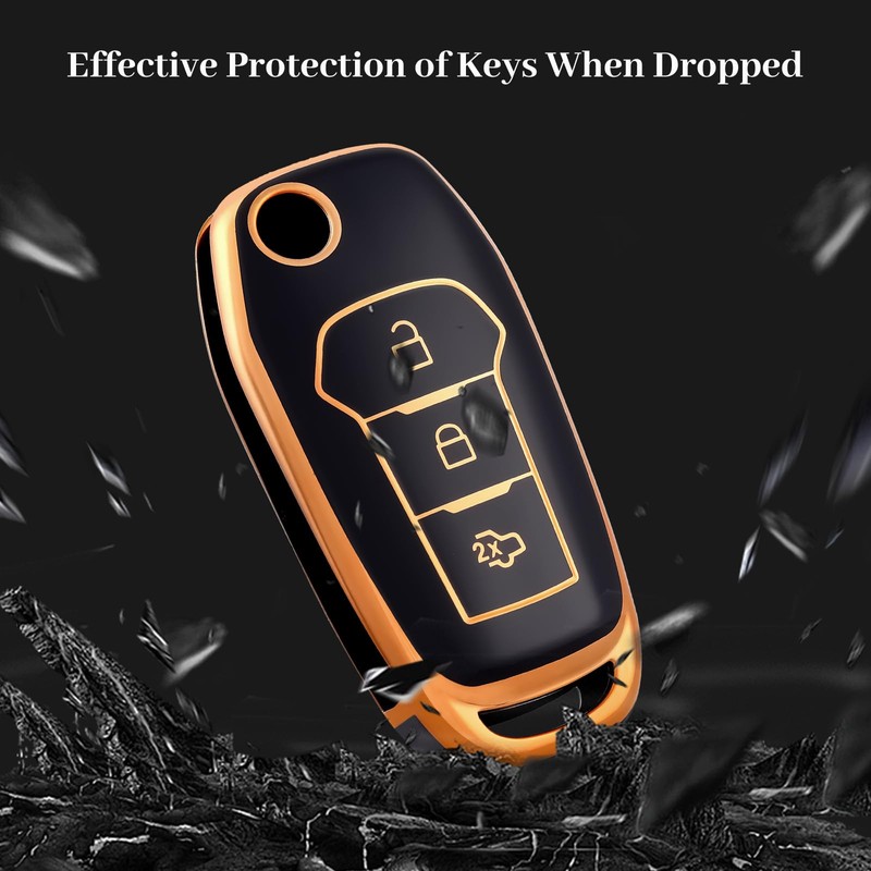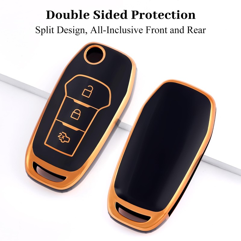 OFF WE GO for Ford Key Fob Cover, Soft TPU Protection Key Fob Case Fit for Ford Maverick F150 F250 F350 F450 F550 Ranger Bronco Expedition Escape Explorer Fusion EcoSport Smart Key (Gold Black)