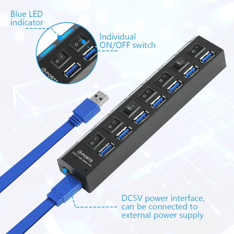 OFFCUP USB Hub 7 Port USB Splitter USB Hub Active 3.0 + 2.0 with Individual Switches and LED Display, Plug & Play, for Laptop PC, MacBook and Other USB Devices