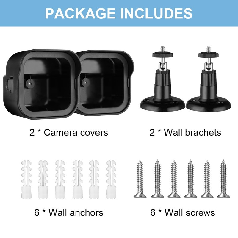 • Blink Camera Mount: For use with Blink camera systems. Black, the package includes Blink outdoor camera protective housing x 2, Blink outdoor camera wall mount x 2, screw accessories x 6, using the mounting accessories in the package, you can easily install the Blink security camera wherever you need. Note: Blink camera not included.