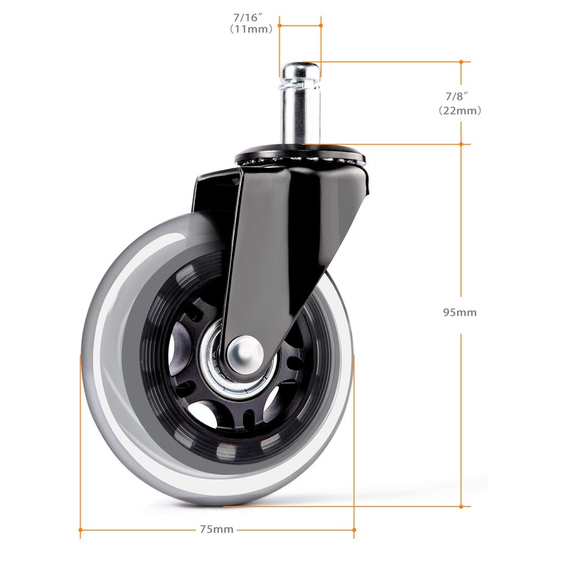 - ✅【Easy to Install】– 10min, no tools required; Universal size stem of 7/16" (11mm) diameter x 7/8" (22mm) length. Pull out your old office chair wheels and push in your new wheels until stem is firmly seated and secure.