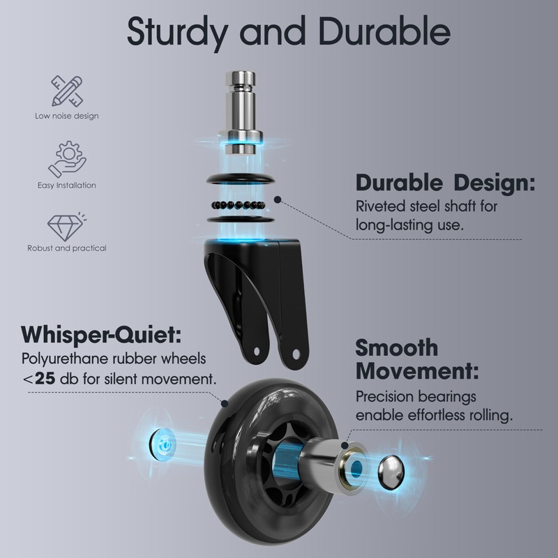 Office Chair Replacement Wheels, Heavy Duty Computer Gaming Desk Chair Rubber Casters - Universal Fit, Safe for All Floor Including Hardwood and Carpet, Quiet and Smooth Gliding, 2.5 Inch