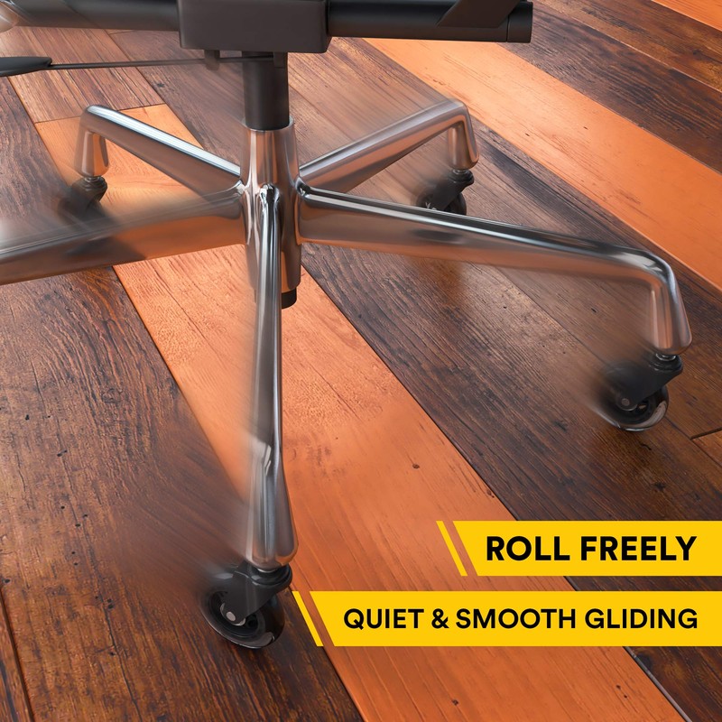 • 🏠 STOP DAMAGING YOUR FLOORS] – SKIP THE DINGY PLASTIC OFFICE CHAIR MAT AND GO-PRO WITH THE ONLY ZERO-DAMAGE, NON MARKING computer chair wheels with a SILENT, ultra-thick clear polyurethane layer guaranteed not to scratch or leave funny marks. EASILY PROTECT your hardwoods, laminate, ceramic tiles, vinyl, terracotta floors! COMPLETELY SAFE on all hard surfaces. (Not recommended for soft carpet)
