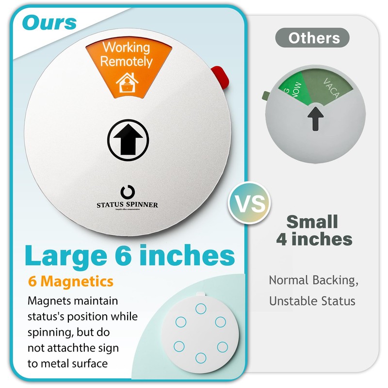 - 6 Status Options: Our Office Door Signs offer 6 distinct statuses - In A Meeting, Working Remotely, Out Of Office, Do Not Disturb, Please Knock, and Back Soon. Easily update your status with a simple tab spin to meet your workspace needs instantly.