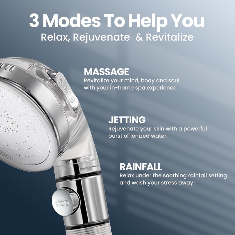 - 3-Spray Settings: Our ShowerEnvy shower head offers a trio of spray functions, including Rainfall, Massage, and Jetting. The integrated Eco-stop button effectively preserves water temperature without requiring adjustments to the water valve.