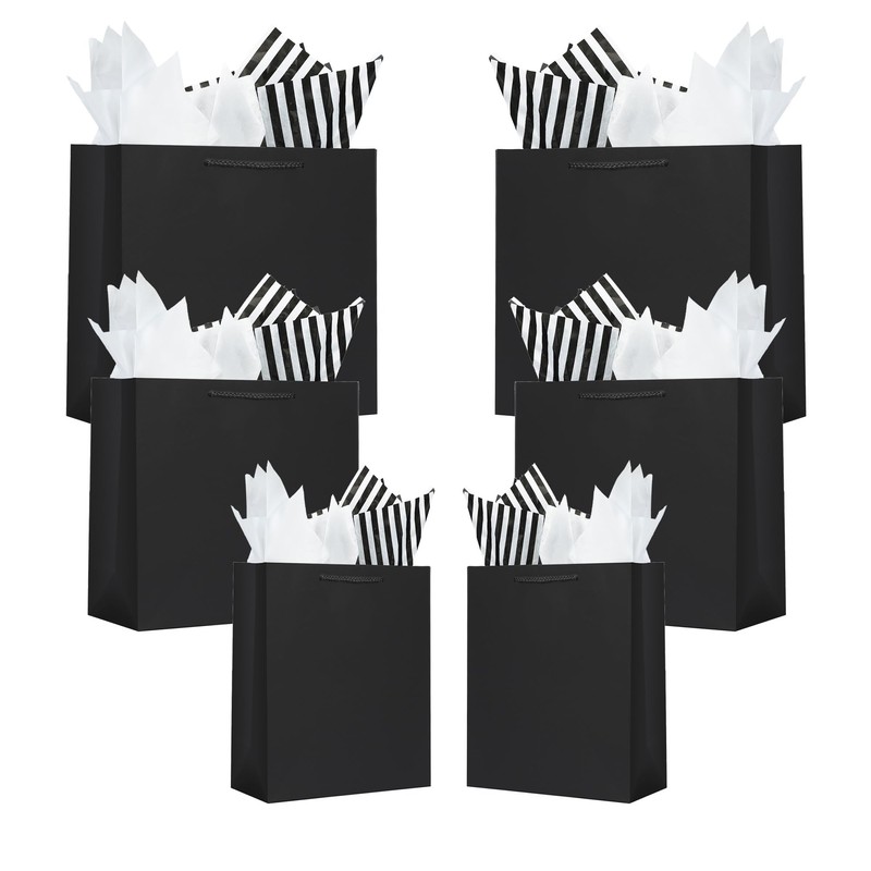 - Quality: Made of 260gsm kraft paper, easy to fold and use, our black paper bags can well pack various presents. Its cardboard bottom also help your bags stand well!
