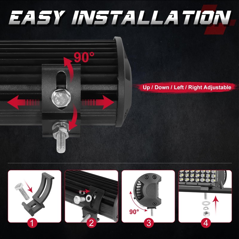 - DEPENDABLE DURABILITY - The light bar is designed to withstand the harshest outdoor elements. It can meet strict IP68 waterproof (can 2 meter water depth, up to 30 minutes) and dustproof standards, and are highly sealed. The die-cast aluminum housing has a durable black powder coating that is rust and corrosion resistant. 12pcs heavy-duty aluminum heat sinks maximize surface area for optimal cooling. The mounting brackets are made of solid iron material with black powder coating so sturdy enough and rust-proof.