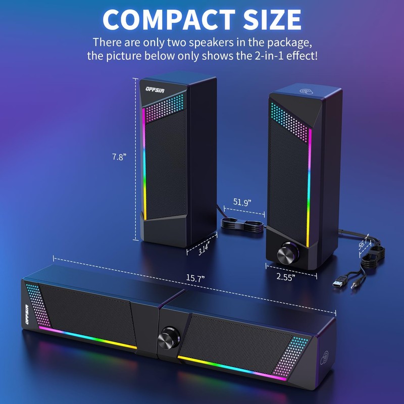 - 【2 in 1 PC Speakers】OFFSIR computer speakers can be a soundbar after easily splicing, innovative 2-in-1 design, which is convenient for you to layout the computer desktop. With compact size, OFFSIR RGB gaming Speakers are ideal for the desktop PC laptop computer.