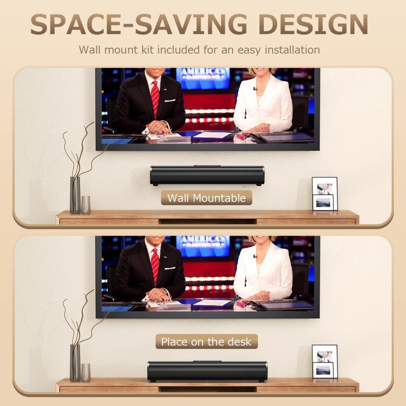 【Stylish and Compact Design】Our 16-inch soundbar is a compact and sleek audio device that great for desktop space especially small to medium-sized living room or bedroom.Our sound bar takes up less space and is effortlessly moveable, making it an ideal TV speakers sound bar!