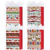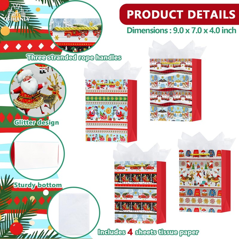 OFIHANLY 4 Pack 9" Small Size Christmas Gift Bags with Handles for Xmas Holiday Presents Red&Gold Cute Paper Wrapping Bag with Tissue Paper for Kids