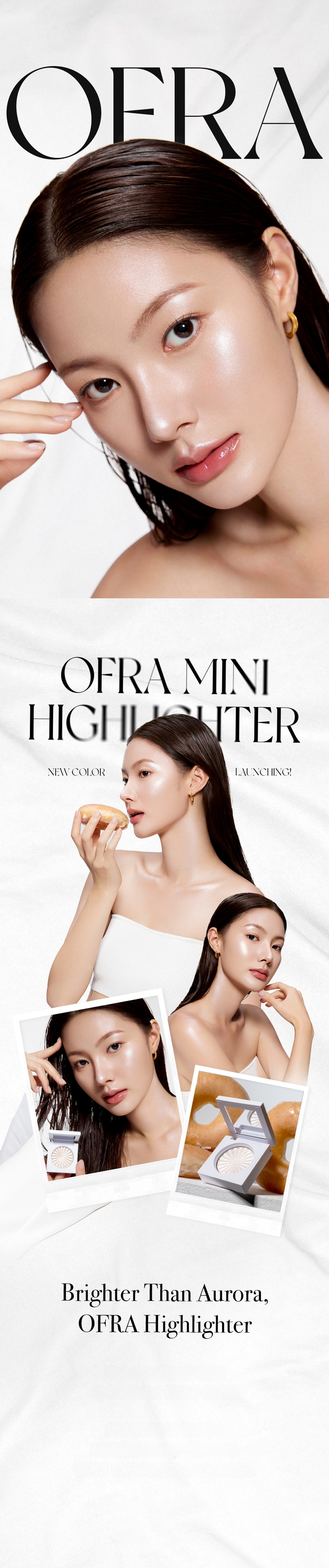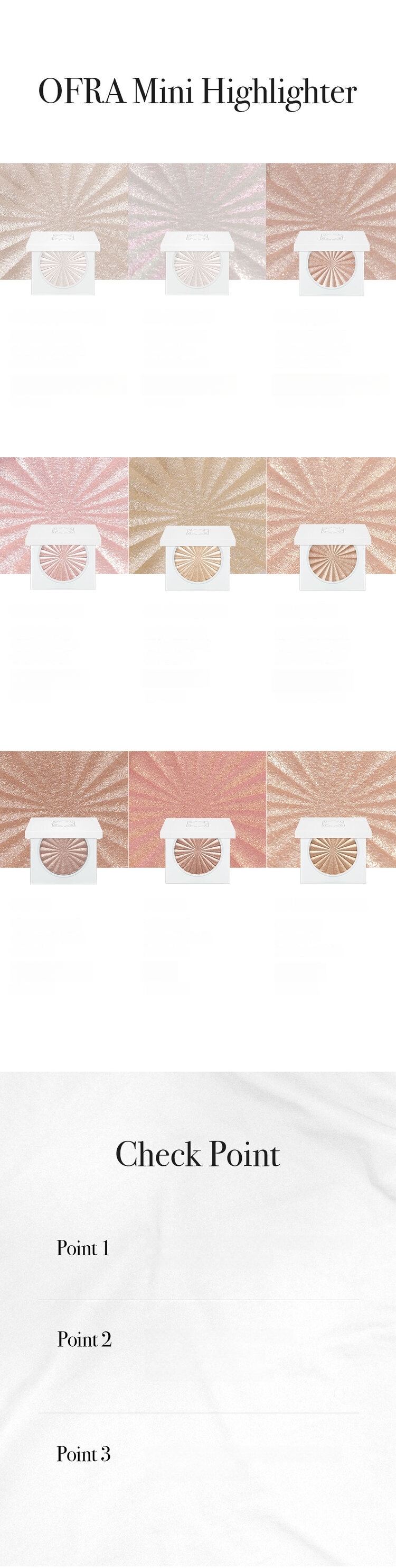 A variety of unique OFRA color shades. Adheres to the skin with ultrafine particles without emphasizing skin texture, providing a moist finish. Can be used for various makeup areas such as eyeshadow, blush, under-eye, and collarbones where dimension is needed. Shows long-lasting durability that remains vibrant with just one touch without needing touch-ups.