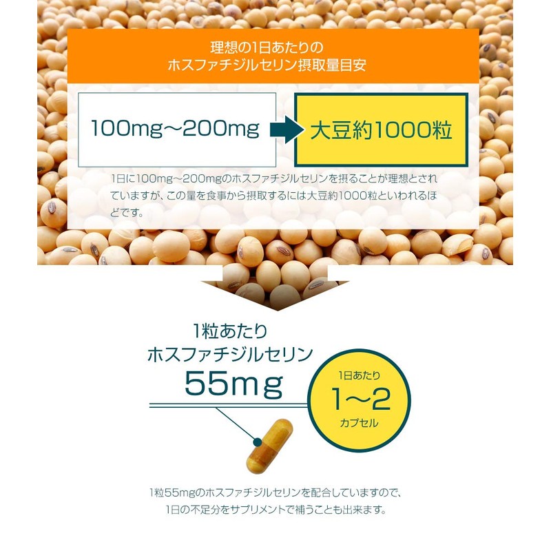 • 【かつてのひらめきを支える成分】ホスファチジルセリンは伝達をスムーズにすると言われており、冴えた毎日のサポートに有用と言われています。食べ物の中でも肉類や大豆などに微量に含まれる程度で、サプリメントで効率的に摂取することが望ましいです。1日に1~2カプセルを目安にお召し上がりください。