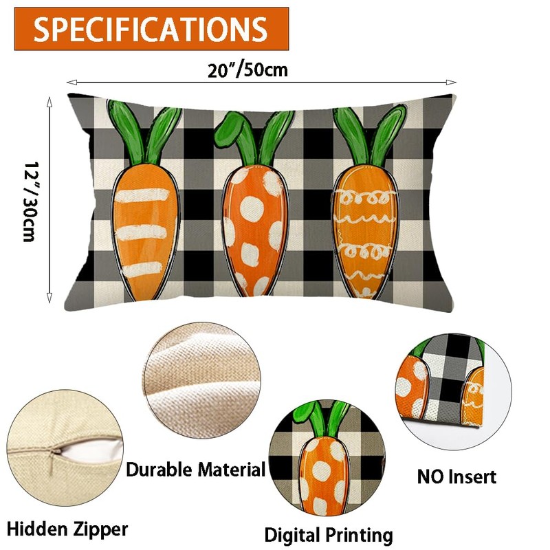 Ogiselestyle Easter Carrot Buffalo Plaid Throw Pillow Cover, 12 x 20 Inch Easter Cushion Case Decoration for Sofa Couch