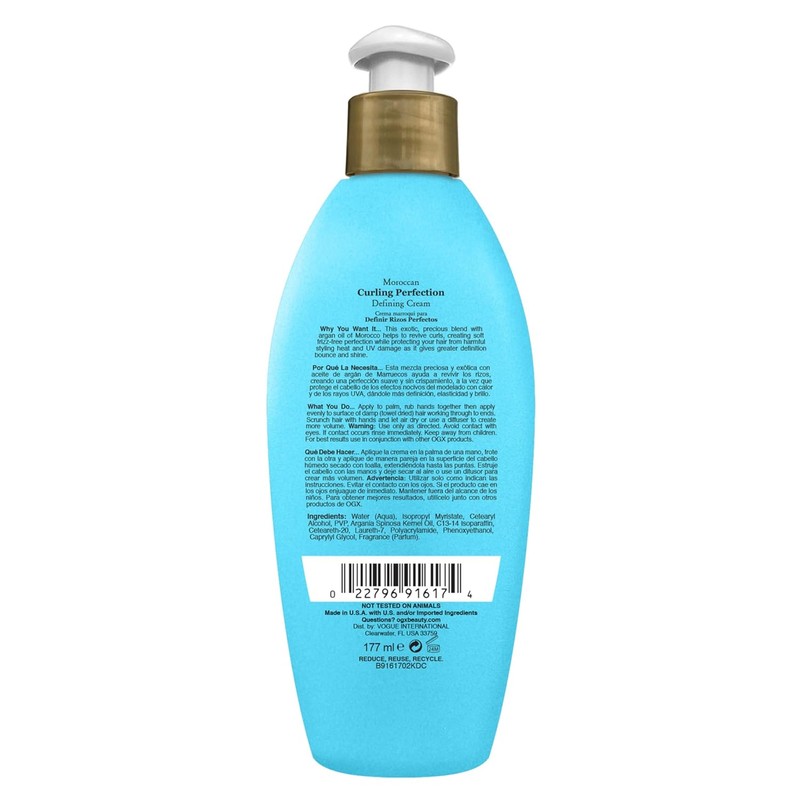 OGX Argan Oil of Morocco Curling Perfection Curl-Defining Cream is a curl cream for curly hair within the curly hair products category, created to define and enhance curls and waves across textures. This rich, hydrating styling cream is formulated with cold-pressed Moroccan argan oil to moisturize, help detangle, and soften strands while helping control frizz and tame flyaways. The paraben-free, sulfate-free formula helps deliver shine and body so curls look defined and feel touchably soft. Scented with bright citrus top notes, a floral-green heart, and a warm woody base, it turns curl care into a sensory experience that leaves hair smelling fresh and vibrant. As a versatile styling cream and hair styling product for all curl types, it helps improve manageability and provides even coverage when worked from mid-lengths to ends on damp hair. Usage tips: start with a dime-size amount, emulsify in hands, apply on damp hair, then scrunch or twist sections; diffuse on low or air dry; add more only as needed—over-application may lead to dryness or a sticky feel. Safe for color-treated hair, this anti-frizz cream supports healthy-looking waves, curls, and coils with a smooth, soft finish that showcases natural pattern and bounce. Key benefits include curl definition and enhancement; frizz control and flyaway taming; moisture and detangling support; body, bounce, and shine; a citrus-floral-woody fragrance; and a paraben-free, sulfate-free formula. Each 6 oz unit is filled to full weight; check the seal before opening. For a complete routine, pair this OGX Renewing + Argan Oil of Morocco essential with the matching Shampoo and Conditioner and other OGX Moroccan oil hair products suitable as part of wavy hair products and curl care routines to help keep hair looking soft, shiny, and defined day after day.