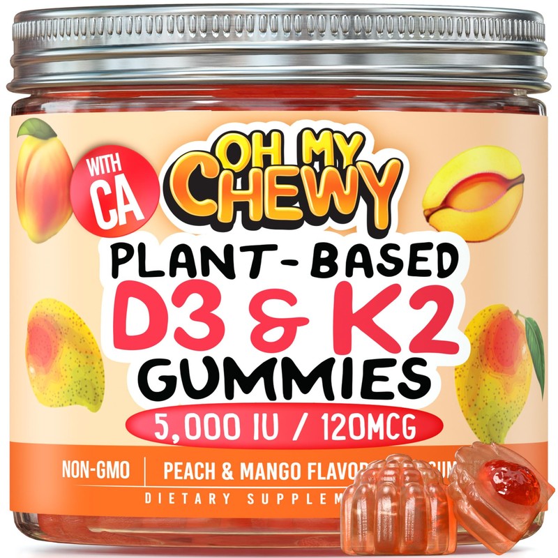 OH MY CHEWY Center-Filled Vitamin D3 K2 Gummies - Kids, Teens & Adults - Supplement for Healthy Teeth, Bone, Energy & Immunity - 5000 IU D3, 120 mcg K2(MK-7), 120 mg Calcium - Vegan & Non-GMO - 60 Count