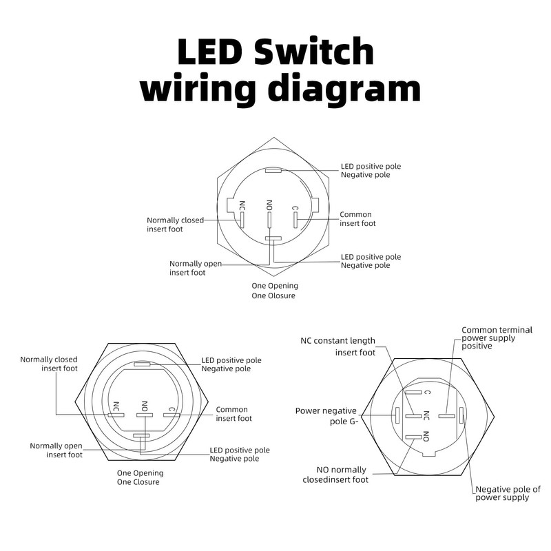- Latching switch: Push it, ON; Push it again, OFF. Refer to the wire diagram.