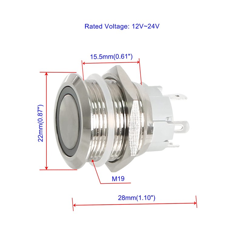 - Mounting Hole Dia: 19mm, Head Dia: 22mm, Total Length: 28mm, Protection Degree: IP67, Button Type: Flat.