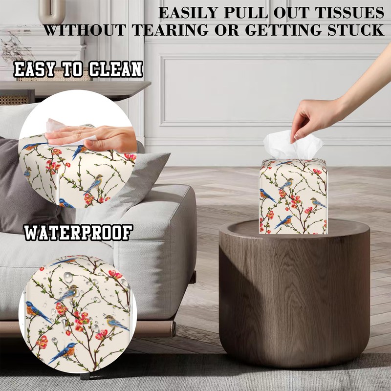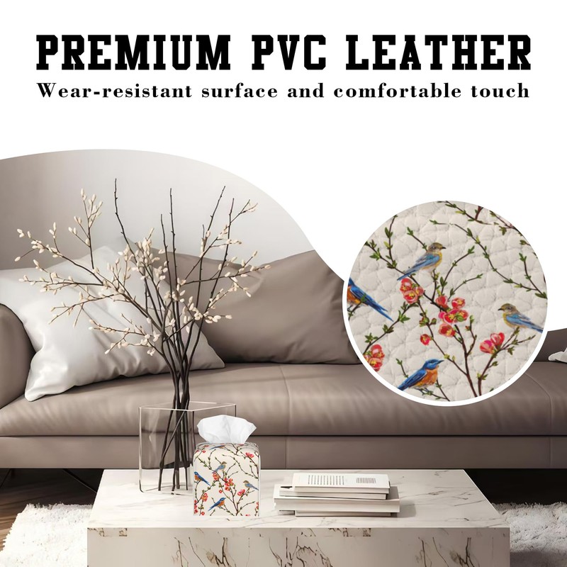 OHEGBXE Tissue Box Holder Bird on Blossoming Branch Square Leather Tissue Box Cover Modern Cube Facial Paper Cover Case for Bathroom Vanity Countertop Night Stands Tabletop