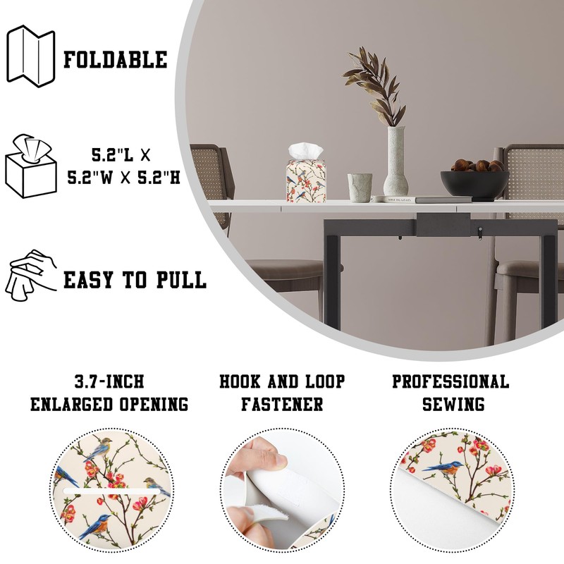 - Applicable Size: The tissue box cover measures 5.2"L x 5.2"W x 5.2"H, suitable for most square tissue boxes. It is designed to be compact, which can not only save space and keep the desktop tidy but also provide clean tissues at any time