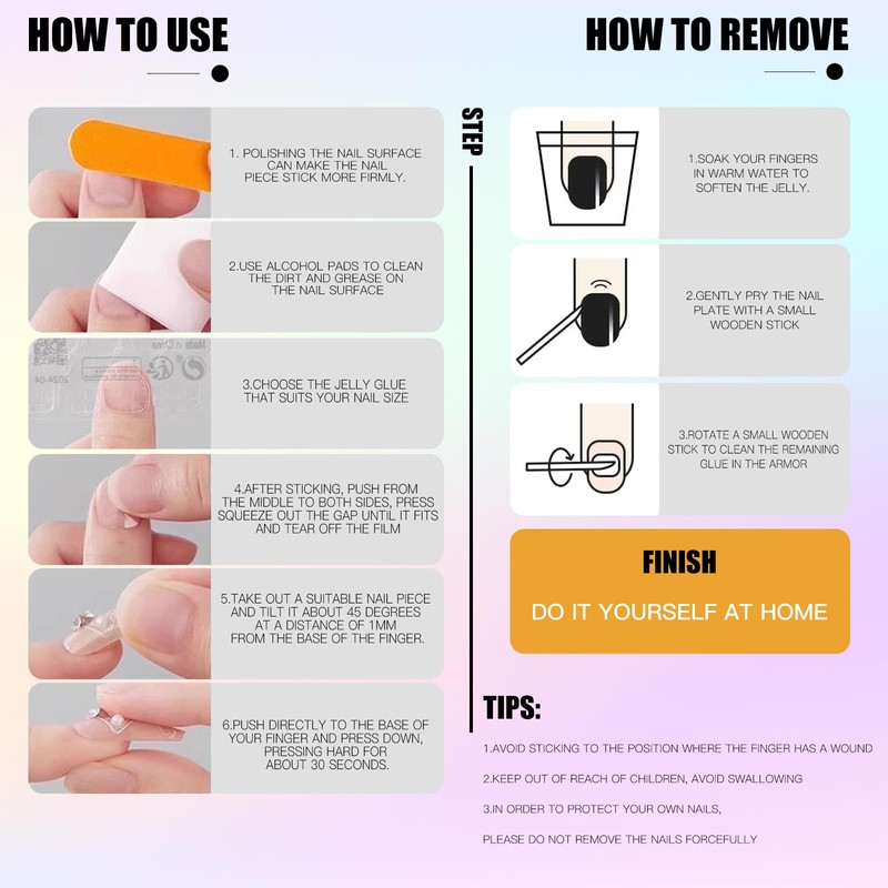 - You can decide wear them for weeks or a few day - We recommend you using nail glue and adhesive tabs togethe if you want to get more than 14 days long lasting. If you want to change the design for few days, only using nail glue will be better. Adhesive tab is a good choice for a date night or a little event, you can remove easily