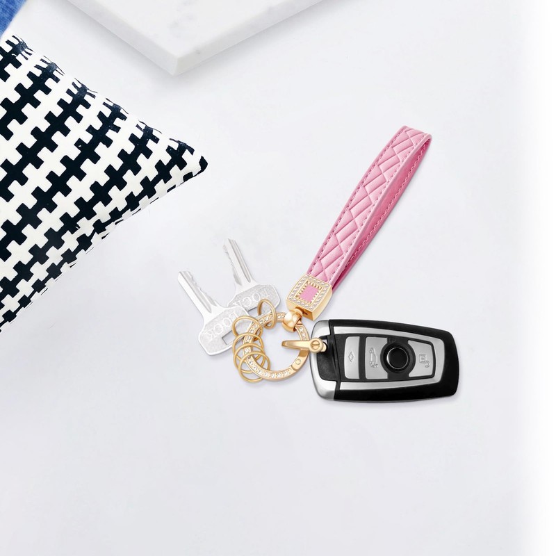 OHKYOOT Microfiber Leather Wristlet Keychain,Key Chain Holder Car Keys Keychain with 5 Key Ring and Anti-Lost D Ring (Pink Gold)